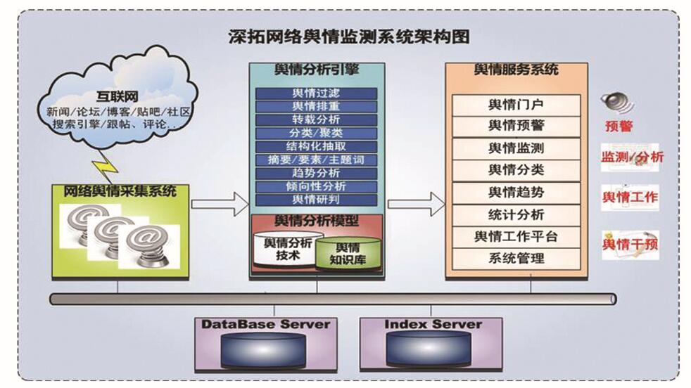 深拓计算机系统集成有限公司惠及了业界优秀的软件开发、舆情分析和传播学等方面的优秀人才,理论里联系实践,形成了特有的并证明是目前国内最为成功实用的舆情监测模型和理念。在舆情监测领域,普遍存着产品功能与客户需求之间的差距,很多公司回避这个难点,不在提倡舆情监测的概念,而是作为一个大而全的管理系统去做,“噱头”和“概念”满天飞。我们认为,现阶段,“及时发现”是舆情检测系统的核心功能,“实用效果”是舆情监测系统的灵魂。不抓住这一点也就失去了舆情监测在现阶段存在的意义和作用。我们做舆情的产品理念就是:按照舆情的传播规律构建监测体系、立体监控、实时追踪、准确分析、辅助舆情工作。真正起到舆情监测的作用,提高舆情应对和管理的质量和效率,为舆情管理和领导决策服务。 产品模块:网络信息雷达、舆情分析引擎、舆情服务平台。 技术支撑:WEB挖掘技术、搜索引擎技术、自然语言处理技术、舆情知识库。 设计理念:“及时发现”是舆情监测系统的核心功能,效果是舆情监测系统的灵魂,定系那个采集和全网搜索相辅相成,按照舆情的传播规律构建立体监测体系,疏而不漏,管线构架,舆情漏斗分析模型,分析力度粗细可控技术结合实践,千锤百炼,功能设计实用至上。 |